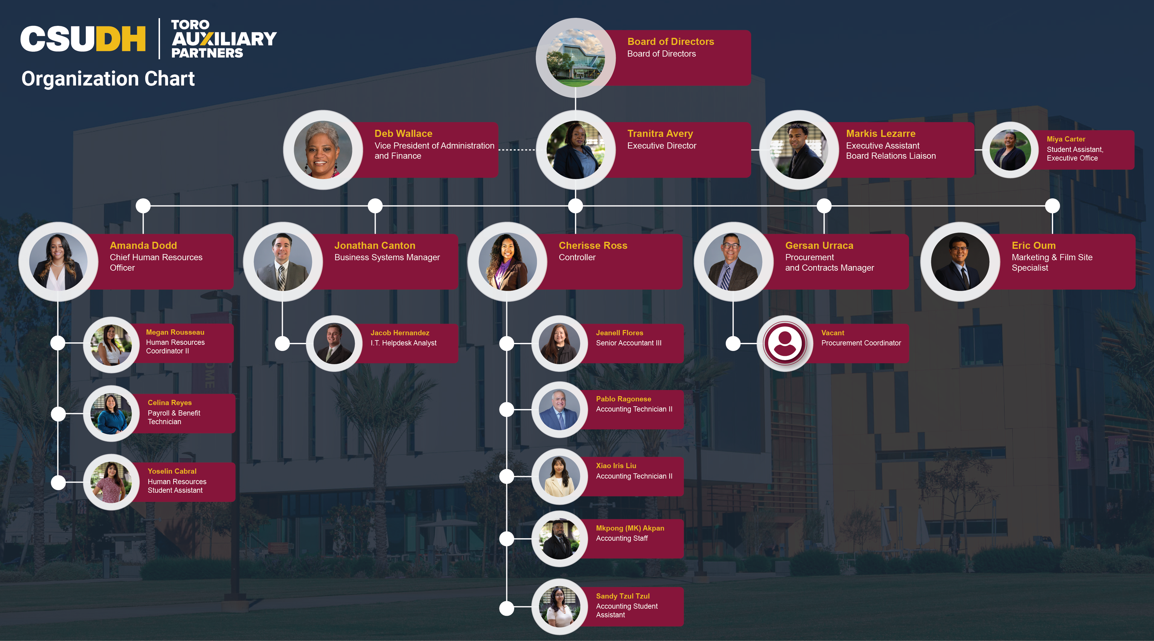 Our Toro Auxiliary Partners team is composed of caring and ambitious individuals dedicated to supporting the mission, goals, and objectives of our university. By working closely with the university, our auxiliary plays a vital role in driving student success and become a comprehensive financial resource and service provider for CSUDH. Our diverse departments - including Human Resources, Procurements and Contracts, Information Technology, Accounting, and Commercial Services - collaborate seamlessly to ensure that our students, faculty, and staff have the resources and support they need to thrive.